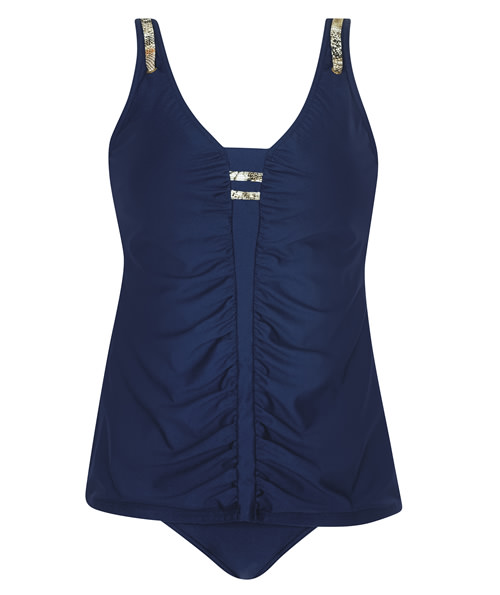 Tankini on kaksiosainen uima-asu, jossa helma peittää housuosan. Olkaimensäätö ja tuetut kupit.