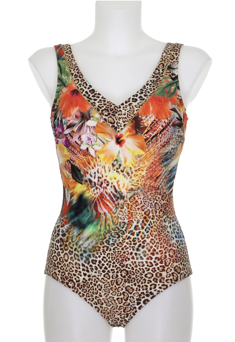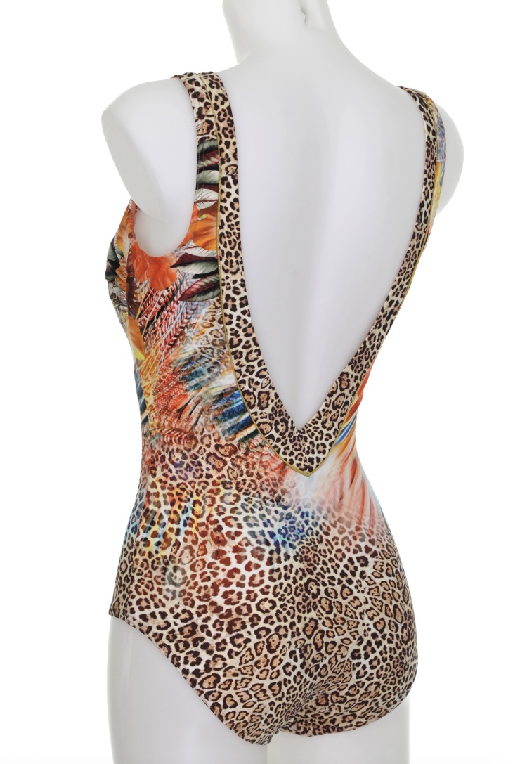 Vuorattu uimapuku, jossa kevyesti topatut kupit. Puku on helppo pukea madalletun selän takia. Puvun keskiosassa on myös liivimäinen tuki.